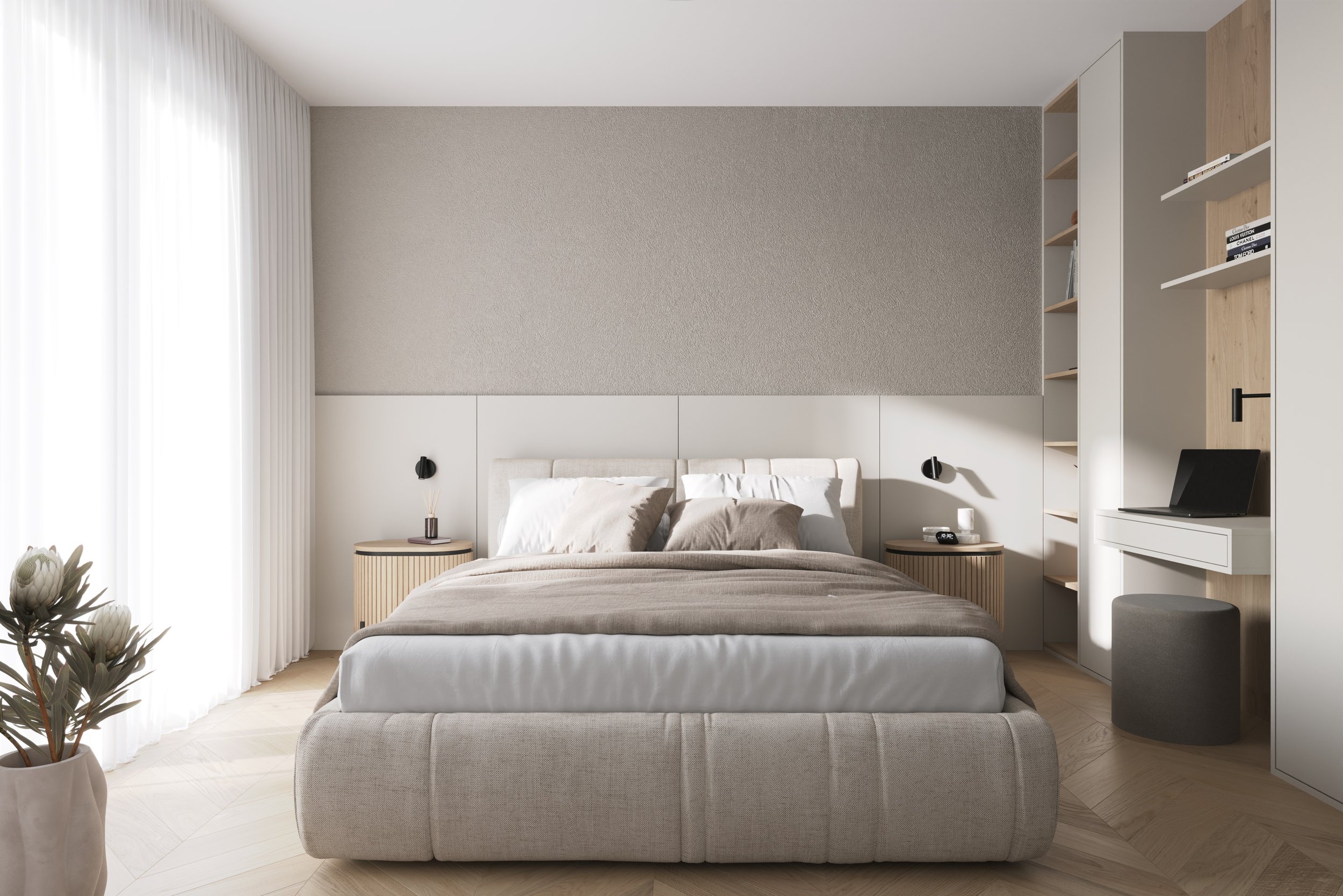 Predmetom riešenia bol návrh kompletného interiéru rodinného domu v Karlovej Vsi. Kuchyňa je prirodzene prepojená s obývacou izbou, čím vzniká otvorený, vzdušný a svetlý obytný priestor. Koncept je založený na použití svetlého dreva, prirodzených tónov a jemnej farebnej palety, ktoré podporujú pokojný charakter interiéru. Celok je navrhnutý v modernom, nadčasovom duchu s dôrazom na čisté línie a funkčnosť.